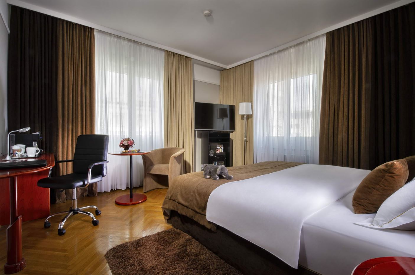 Per un comfort ottimale, le camere Deluxe sono climatizzate, spaziose e lussuosamente arredate con il letto king size da 180 x 200 cm, fodera in piuma d’anatra, un’ampia selezione di cuscini e biancheria da letto in morbido cotone a 400 fili in rasatello. Ogni ospite può usufruire della macchina da caffè, della cassaforte per computer portatile, dei prodotti di bellezza L’Occitane nei bagni, del frigobar ben fornito e del televisore LCD. Alcune camere offrono anche un divano che si trasforma in un comodo letto supplementare (160 x 200 cm) per le bambine e i bambini. La dimensione media delle camere è di 32 m².